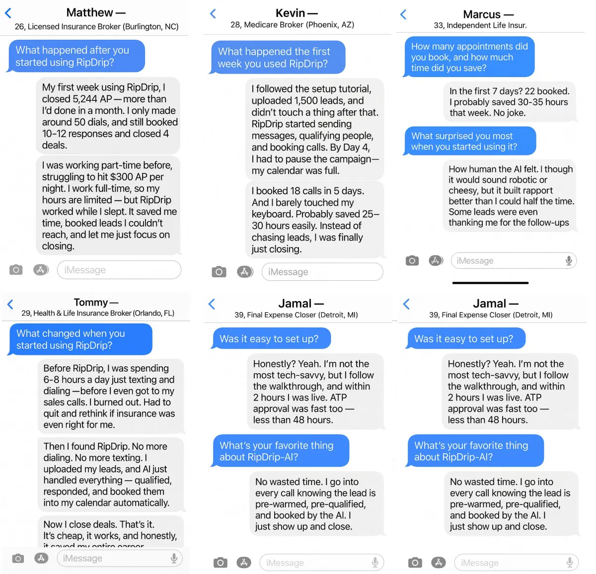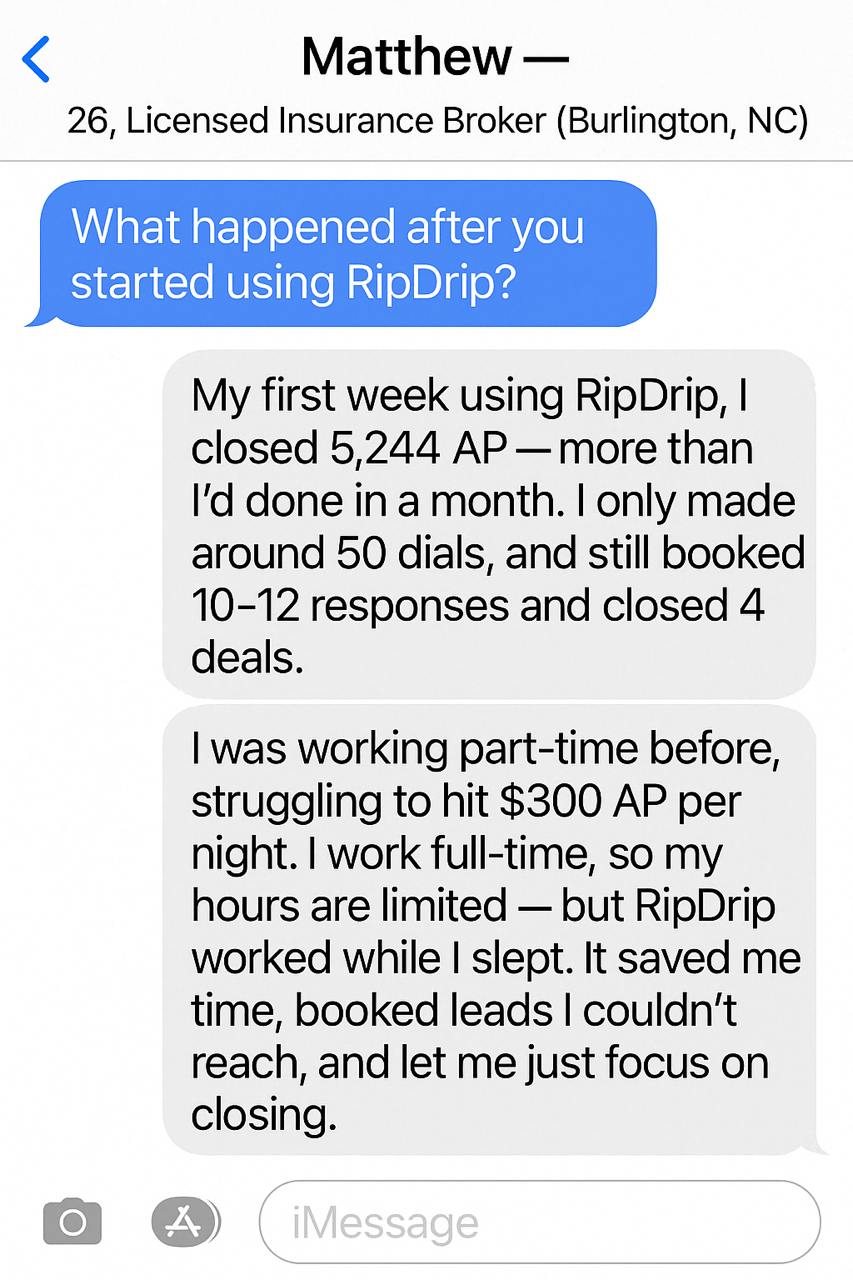 "I wouldn't be in the sales industry today if not for RipDrip. I've become so dependent on this that I don't see any other way I could be an agent. I've already booked dozens of appointments as I go about my day."